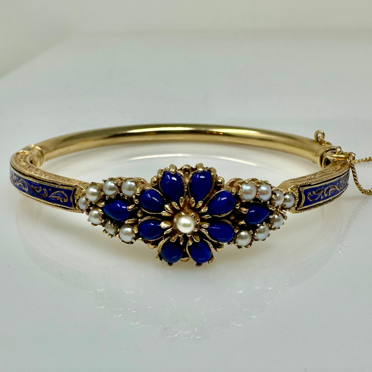 Antique American 14 Karat Yellow Gold Lapis Lazuli, Pearl & Blue Enamel Bangle Bracelet.