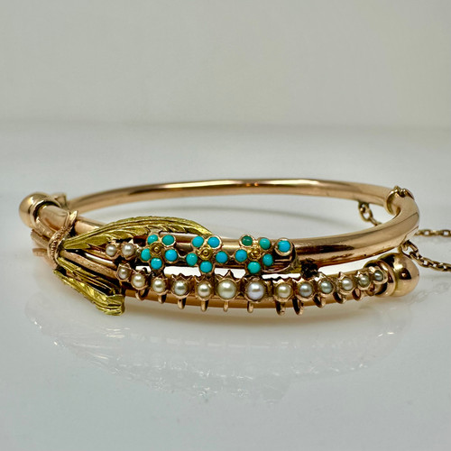 Antique American 14 Karat Yellow Gold Persian Turquoise & Pearl Bangle Bracelet.