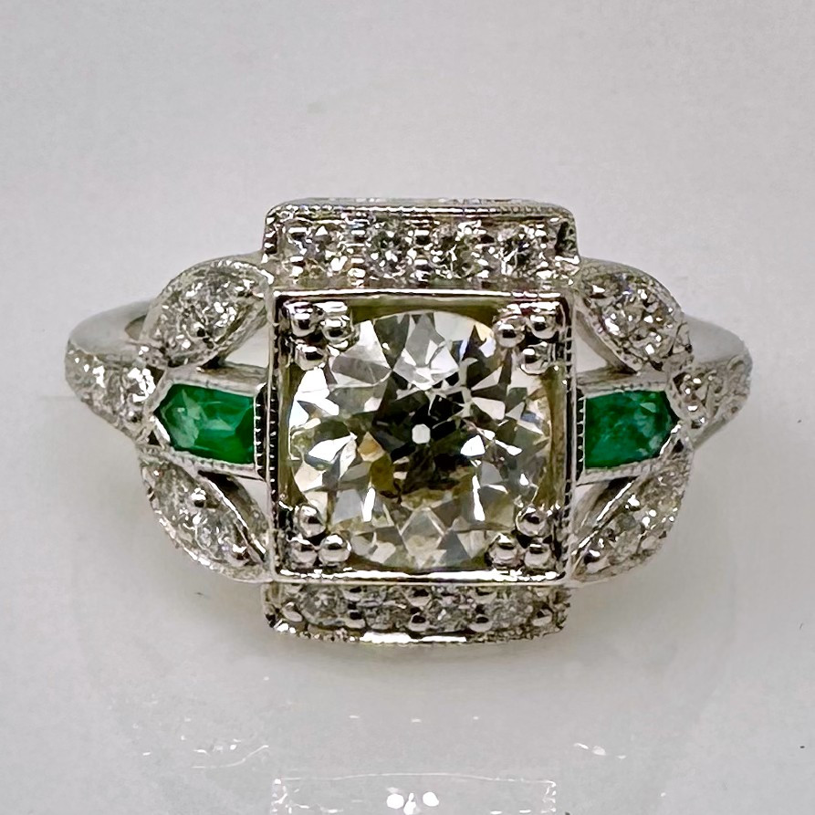 Antique Art Deco 18 Karat White Gold 1.04 Carat Diamond and .40 Carat Emerald Ring.