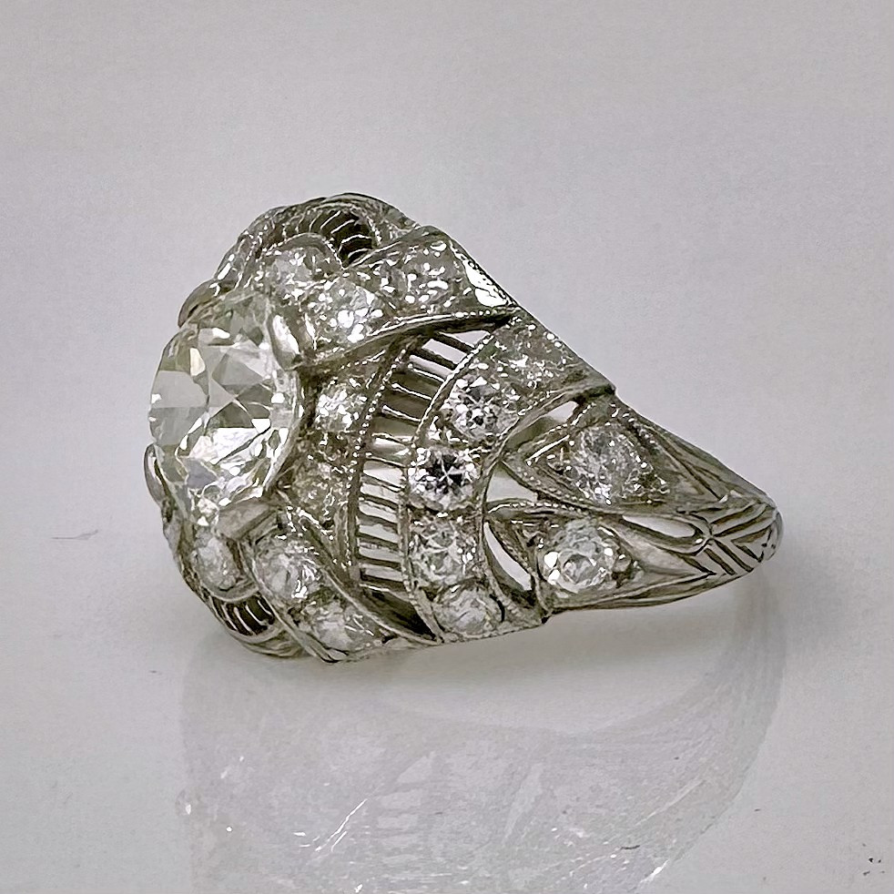 Antique Art Deco Platinum & Euro-Cut Diamond Ring. Center Diamond: .55 Carats, 1.36 Carats tw