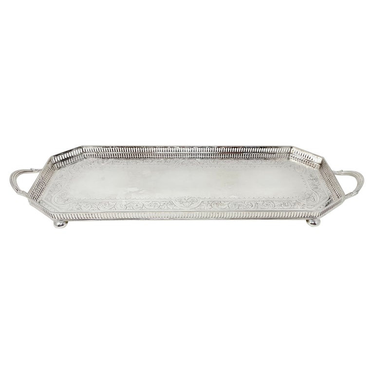 - Antique English Silver-Plated Drinks Tray, Circa 1880. This Long and Narrow Drinks Tray is Footed with a Gallery and Handles on Each Side.
