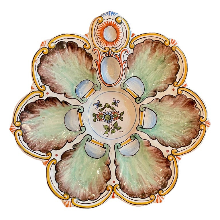 - Antique French Faience "St. Clements" Porcelain Multi-Colored Oyster Plate, Circa 1890-1910.